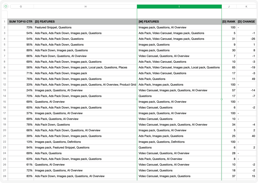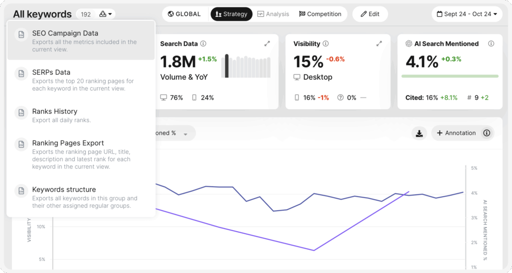 Export unified tracking data from any campaign. The CSV structure now includes AI Overview performance (Desktop and Mobile), ChatGPT or Gemini data, alongside traditional Google rankings. Ready for your reporting workflows.