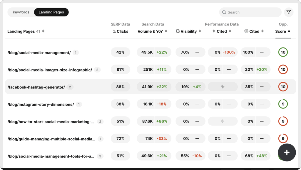 See which landing pages earn citations in AI Overviews, ChatGPT, and Gemini. Not just keyword performance—actual page-level insights.