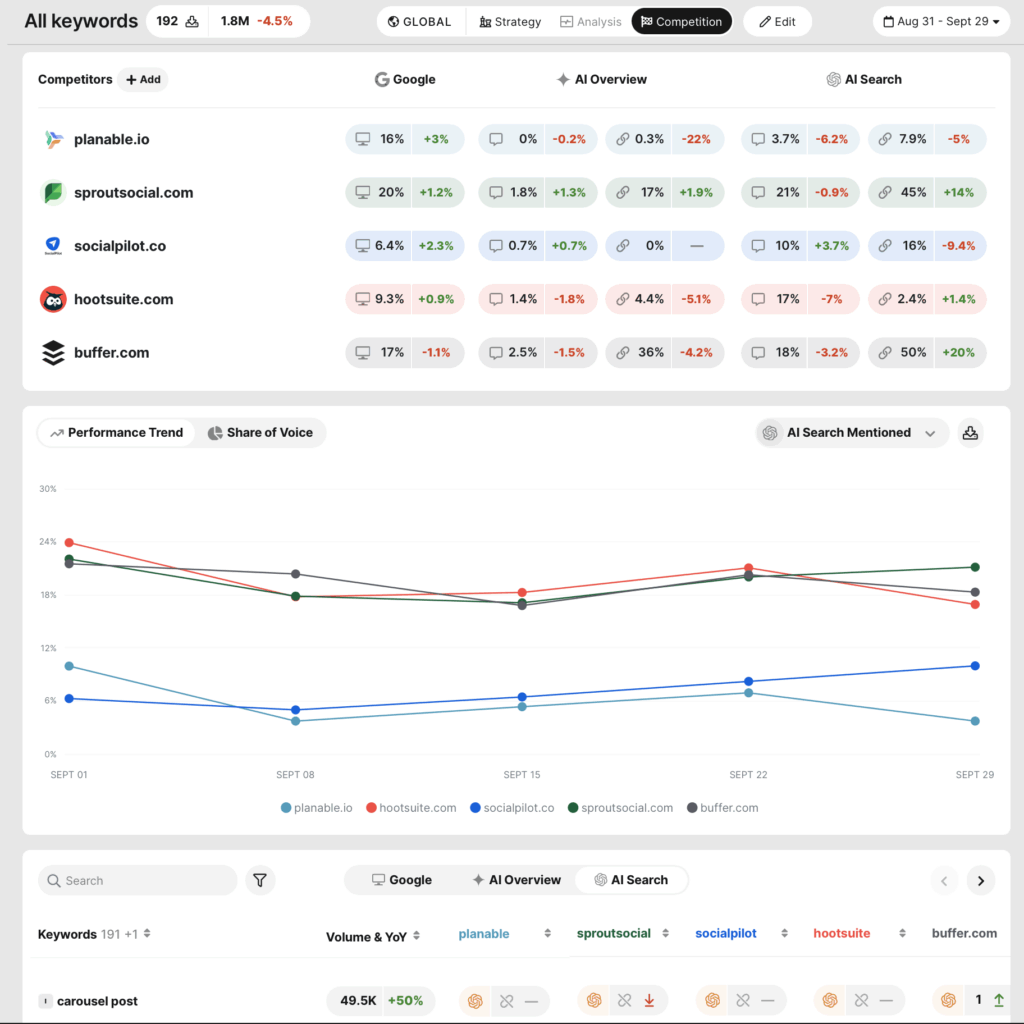 Your success is relative. That’s why we track all competing websites and brands across Google, AI Overviews, and AI Search—without you lifting a finger.