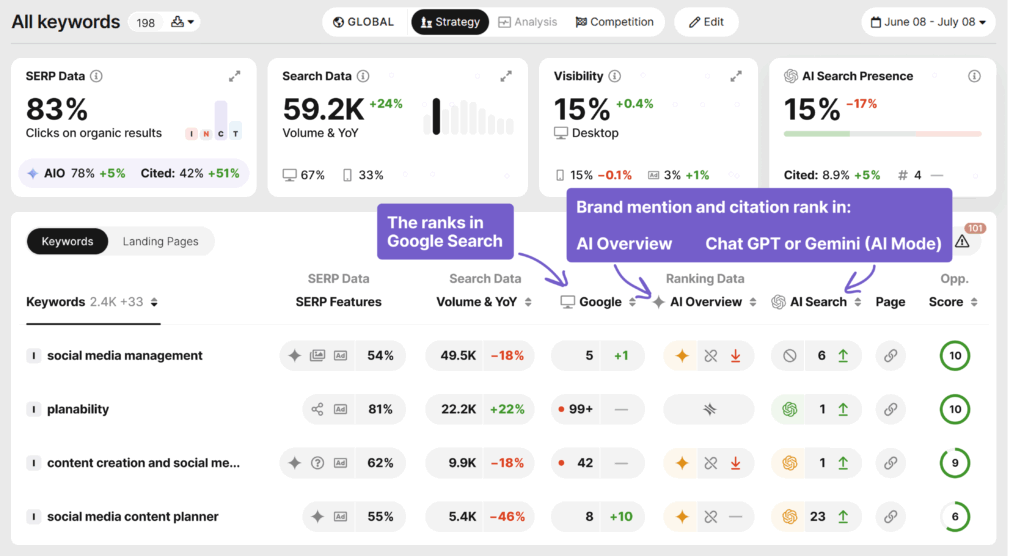 Now track Google, AI Overviews, and AI chatbots in one unified dashboard. See who’s winning, where they’re cited, and which brands dominate—with automatic competitor tracking and volume-weighted metrics that show real impact.
