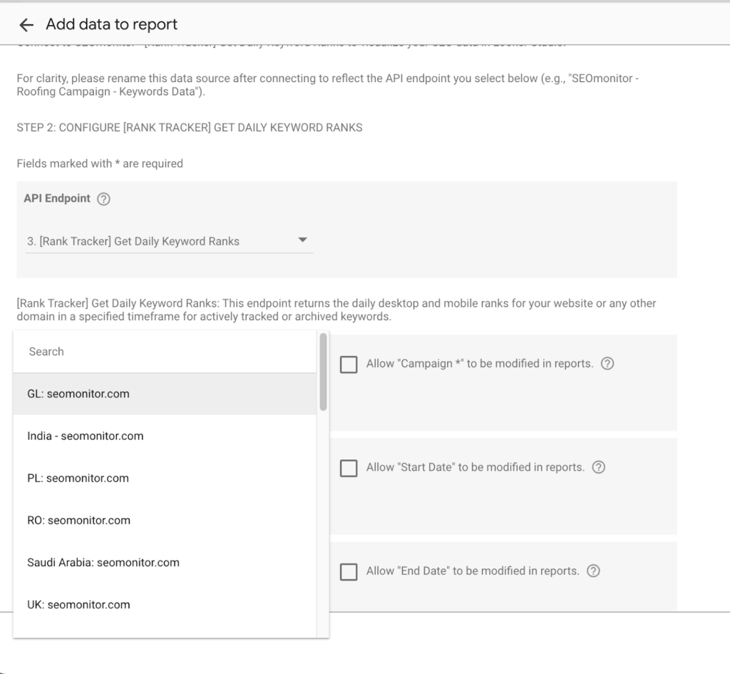 [Image Placeholder: A screenshot of the new Looker Studio configuration screen, Step 1. Highlight the “API Endpoint” dropdown menu, showing it expanded with various options categorized by module like [Dashboard], [Rank Tracker], and [Forecast].]